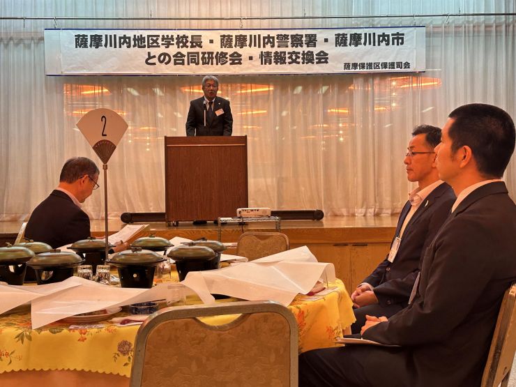 田中会長、松下保護観察所長、藤田教育長からの挨拶、そして川薩保健所、薩摩川内警察署、川内薬剤師会、市保健福祉課様より講演をいただきました。