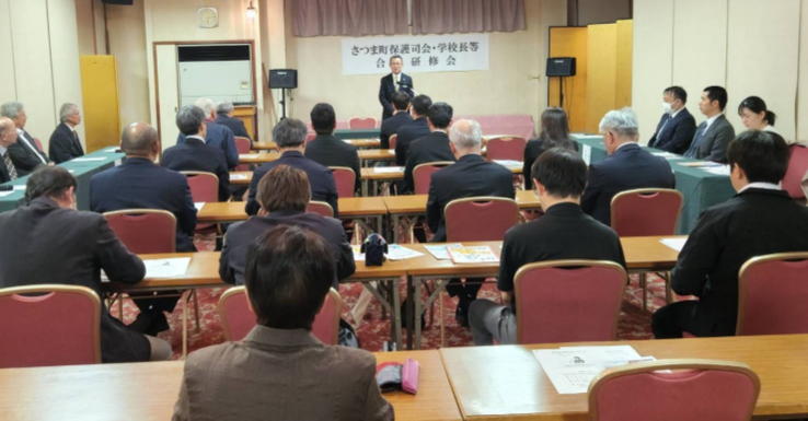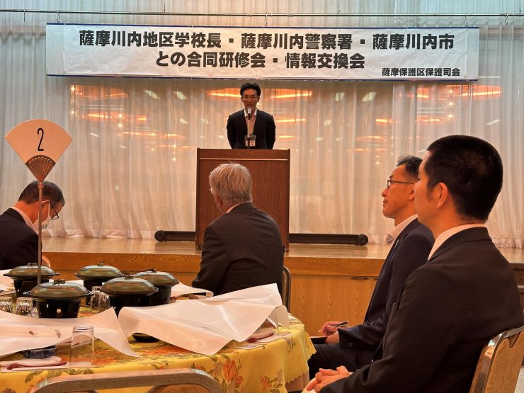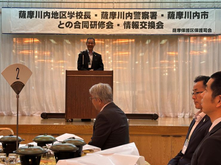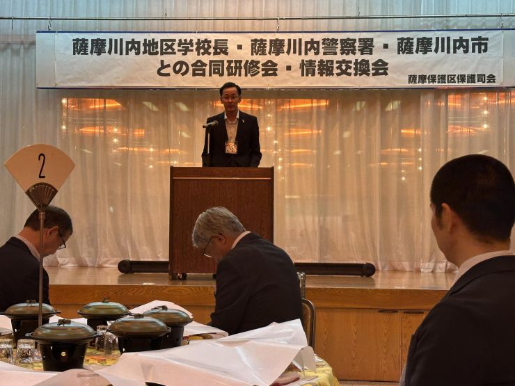 田中会長、松下保護観察所長、藤田教育長からの挨拶、そして川薩保健所、薩摩川内警察署、川内薬剤師会、市保健福祉課様より講演をいただきました。